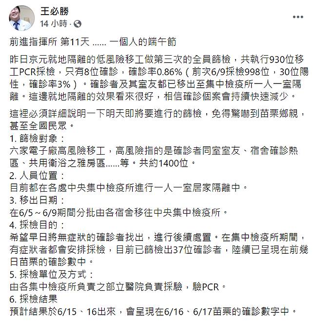 Jun 05, 2021 · 京元電子竹南廠爆出群聚,指揮中心醫療應變組副組長王必勝,又被派出在京元電子設立「前進指揮所」,第一天深夜,王必勝在臉書上發文. Jun 07, 2021 · 王必勝昨天深夜在臉書( facebook )發文指出,京元電子超過 7000 名員工篩檢,發現移工確診率比本國員工高很多,因此決定讓所有移工暫停工作,高風險的 800 多人移到集中檢疫所,低風險者就地隔離限制外出。 Jun 05, 2021 · 王必勝進駐後昨天深夜發文表示,狀況比想像中複雜嚴峻,希望給他們一點時間。. Jun 05, 2021 · 王必勝二度奉命設立前進指揮所,此次地點為苗栗。(圖/翻攝臉書/王必勝) 記者柯振中/綜合報導. Jun 22, 2021 · 醫分析四點王必勝進駐優勢 台大婦產科醫師施景中在臉書發文表示,他以自己20多年前所開過植入性胎盤的刀為例,指出「第一次開這個刀時,失血. Jun 15, 2021 · 王必勝也在臉書說明今(15日)進行的篩檢,他指出「六家電子廠高風險移工,高風險指的是確診者同室室友、宿舍確診熱區、共用衛浴之雅房區等. Jun 27, 2021 · 醫師林靜儀在臉書貼出「近10日雙北確診人數圖」感嘆,「難怪台北市柯市長在拒絕中央派員之後第6天,公開表示『找王必勝協助大規模pcr. 醫療應變組副組長王必勝稍早也回應不要過度解讀,下午再於臉書發文表示環南疫情已得到相當程度的控制。 民視 • 2021年7月9日 下午 01:20